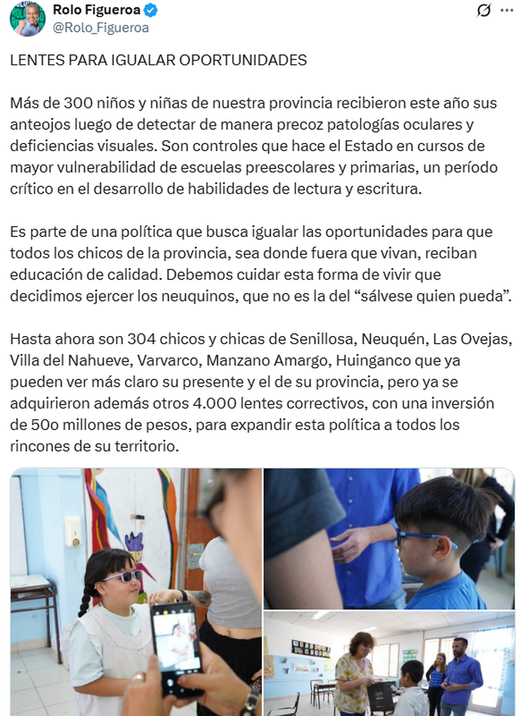 El gobernador Rolando Figueroa destacó que los lentes permiten "igualar oportunidades". En las redes sostuvo que el plan "es parte de una política que busca igualar las oportunidades para que todos los chicos de la provincia, sea donde fuera que vivan, reciban educación de calidad".