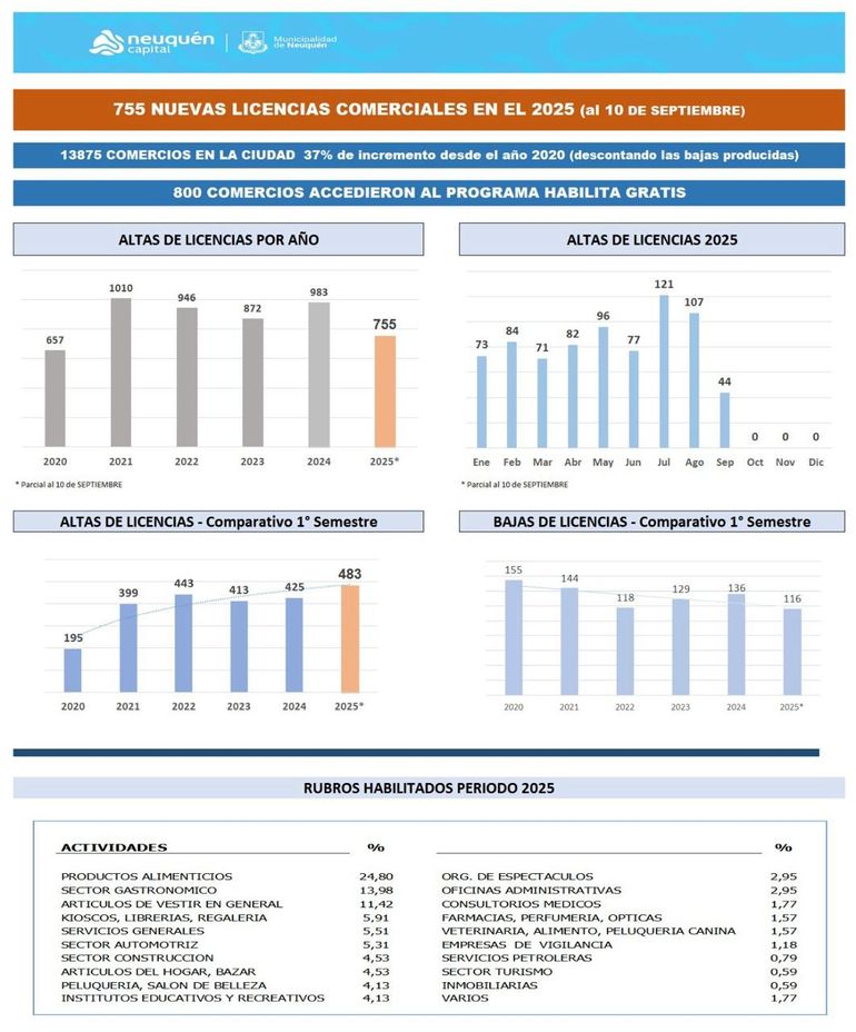 Sin embargo, no todo se concentra en lo tradicional. “Han crecido rubros vinculados a la construcción y al turismo. Y en especial, este año hemos habilitado muchísimas barberías, peluquerías y salones de belleza, a diferencia de otros años, que era muy poca la oferta de estos servicios”, detalló la funcionaria, destacando la diversificación que empieza a caracterizar a la economía neuquina.