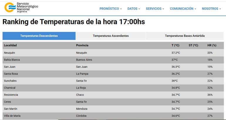 Así lo registró el Servicio Meteorológico Nacional (SMN) en su parte de la hora 17. La ciudad de Neuquén encabeza el ranking con 37.2 grados, seguido por la ciudad del sur bonaerense de Bahía Blanca con 37 grados. En tercer lugar, se encuentra San Juan con 36.3; al que le sigue la capital pampeana, Santa Rosa, con 36.2. En tanto que, en quinto lugar, está la ciudad santafesina de Sunchales con 36 grados.