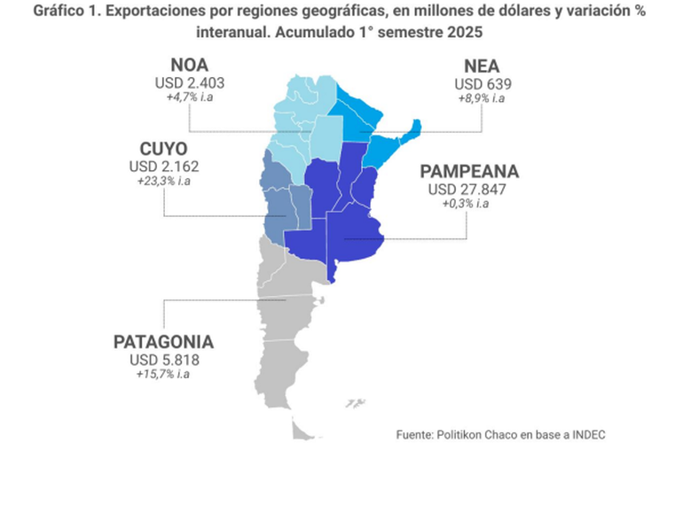 Politikon Chaco señala que “entre estas seis provincias mencionadas, concentraron el 79% del total de las exportaciones argentinas del primer semestre del año”.