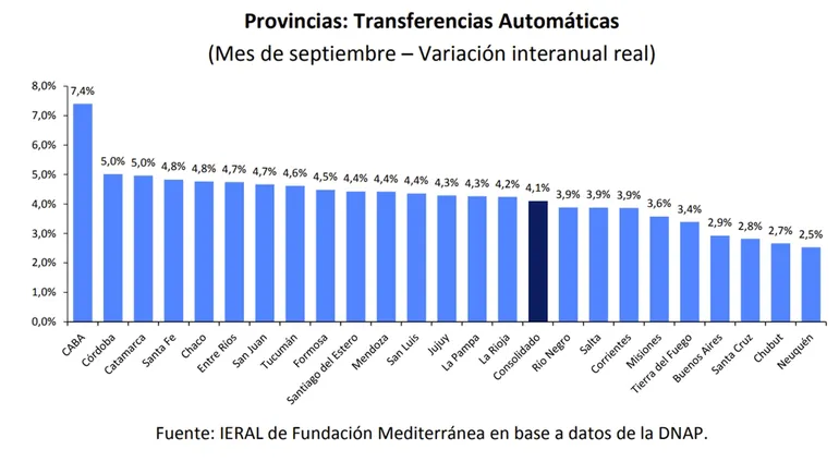 "Las transferencias totales a provincias a valores constantes habrían subido 0,4 por ciento anual en septiembre, con mayores subas en CABA (+14%), Santa Cruz (+13%) y Tucumán (+12%) y máximas caídas en Neuquén (-19%) y Chubut (-6%)", cita el informe del Ieral.