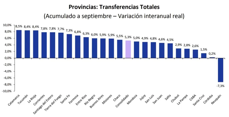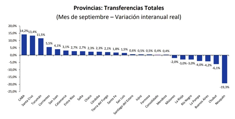 Las transferencias automáticas que recibió Neuquén en septiembre presentan un incremento del 2,5 por ciento interanual, el más bajo que se observa entre todas las jurisdicciones. El aumento más alto en esta materia se da en la Ciudad de Buenos Aires, con 7,4 por ciento más recursos a valores constantes que el año pasado.