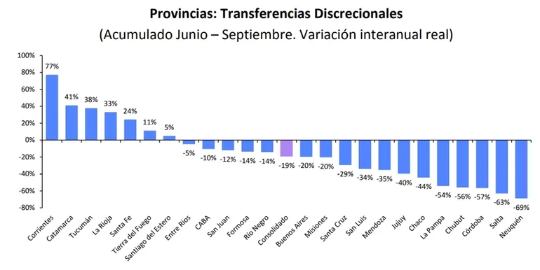 Luego los economistas a cargo del análisis dan pistas para entender cómo se profundizó el ajuste con el paso de los meses. "En setiembre, el ajuste de las transferencias discrecionales se acentuó, con algunas excepciones: se estima una caída del 26 por ciento interanual en términos reales, con una merma del 90 por ciento para Neuquén y del 81 por ciento para Chubut, pero con incrementos de 118 por ciento para Tucumán y de 73 por ciento para Santa Cruz", señalan.