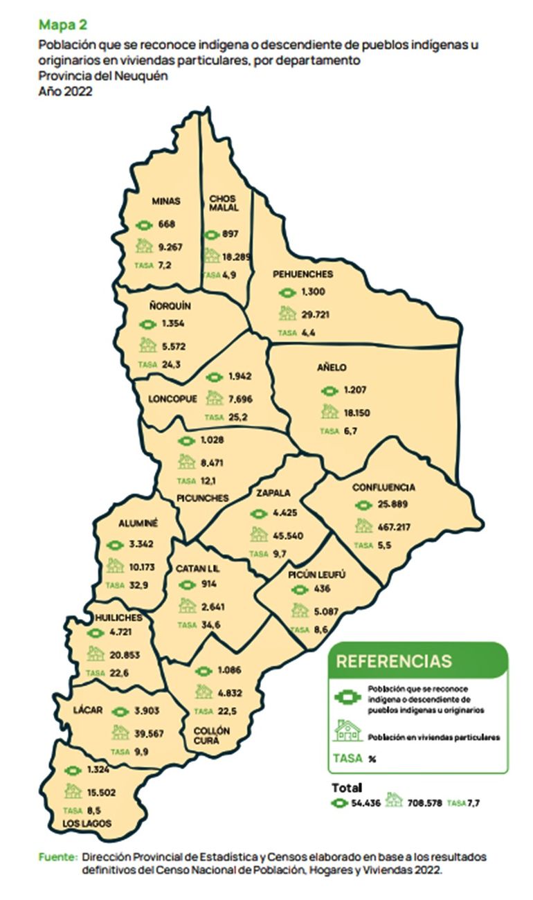 En Catan Lil y Aluminé se registró la mayor tasa de población indígena de la provincia (30%). Mientras que en Loncopué, Ñorquín, Huiliches y Collón Curá los descendientes de originarios van del 25,2 al 22,5 de la población de cada localidad.