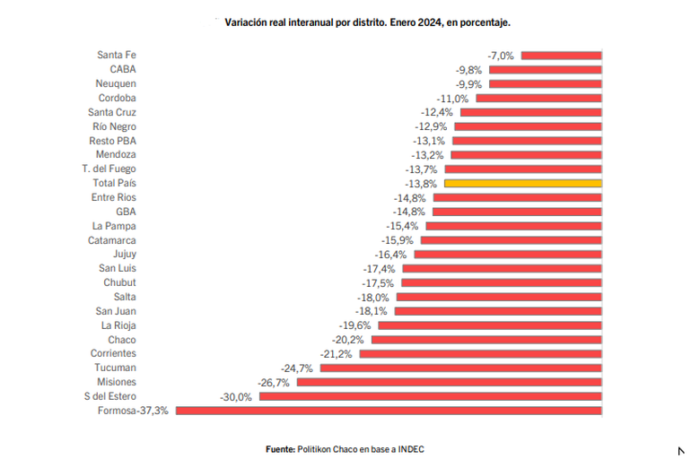 “Los descensos más leves se registraron en Santa Fe (7%), CABA (9,8%) y Neuquén (9,9%), siendo las únicas tres jurisdicciones con bajas de un solo dígito”, destaca un informe de la consultora Politikon Chaco.