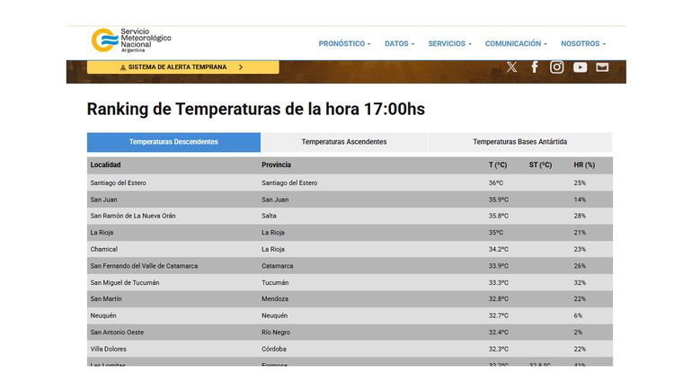 De acuerdo al ranking de temperaturas del SMN, Neuquén estuvo en el top 10 de ciudades donde las altas temperaturas castigaron a sus vecinos. En este caso no se consagró como la más calurosa, en el primer puesto a las 17 de hoy estuvo Santiago del Estero con 36 grados y San Juan con 35.9 grados en segundo lugar. En tanto que, en el tercer puesto quedó San Ramón de La Nueva Orán de Salta con 35.8 grados; en el cuarto lugar, La Rioja con 35 grados y sexta la riojana Chamical con 34.2 grados. En séptimo puesto resultó San Fernando del Valle de Catamarca de la provincia homónima con 33.9 grados y octavo puesto quedó la mendocina San Martín con 32.8 grados. En el noveno, Neuquén con 32.7 grados.