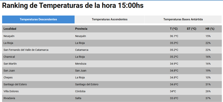 La ola de calor no da tregua en Neuquén y este domingo el termómetro marcó otro récord. Esto quedó demostrado en el ranking de temperaturas del Servicio Meteorológico Nacional (SMN), donde la capital provincial se posicionó en el primer lugar esta jornada.