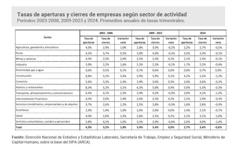 La Secretaría de Trabajo analizó la evolución demográfica empresarial de las últimas dos décadas y distinguió tres etapas. Entre 2003 y 2008 el stock de empresas creció a un ritmo anual promedio del 1,8%. Entre 2009 y 2023 el nivel se mantuvo estable, sin variaciones significativas. En 2024 comenzó una fase contractiva, con una reducción neta del 0,6%.