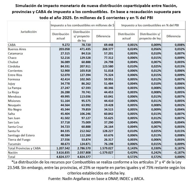 En función de la cantidad de litros de combustibles que se venden en cada estado subnacional, los estados que se llevarían la mayor parte son Buenos Aires, que pasaría de $203.058 millones a $471.435 millones al año.