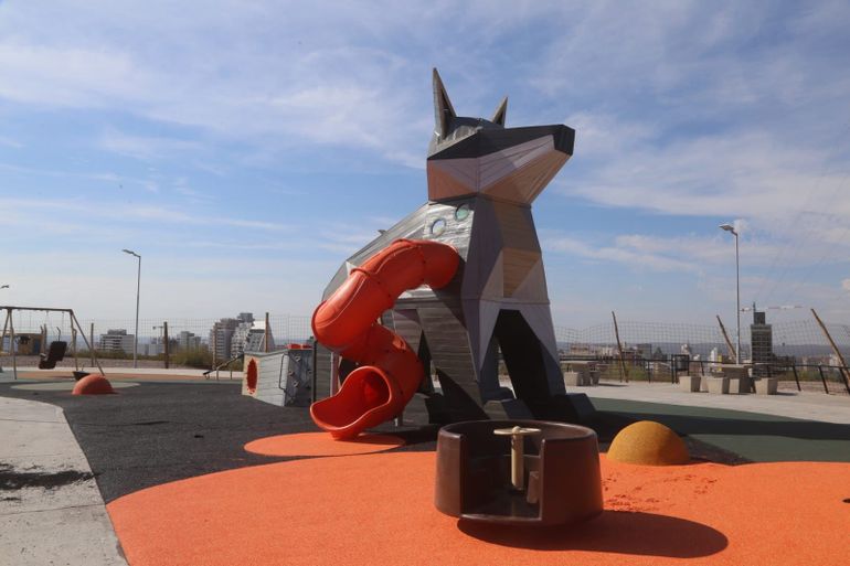 La estructura principal del espacio es un mangrullo con forma de zorro patagónico, pensado como un juego integral y, al mismo tiempo, como un símbolo de la fauna característica de las bardas neuquinas.
