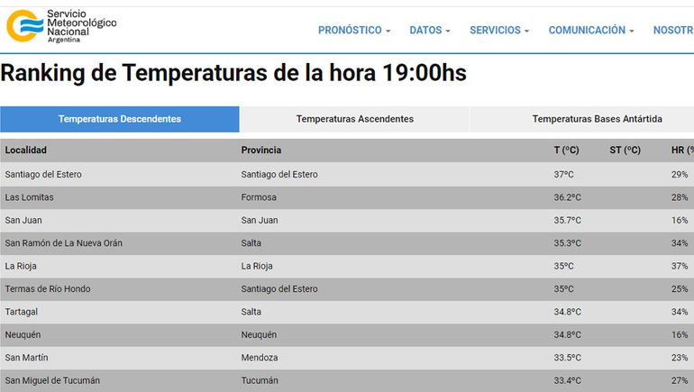 Pasadas las 19 el calor seguía castigando la ciudad de Neuquén, que se mantenía dentro del top diez, pero ya en el octavo lugar con 34,8 grados. El primer puesto quedaba en manos de Santiago del Estero con 37 grados. Le seguían las ciudades de Las Lomitas (Formosa), San Juan, San Ramón de la Nueva Orán, La Rioja, Termas de Río Hondo y Tartagal.