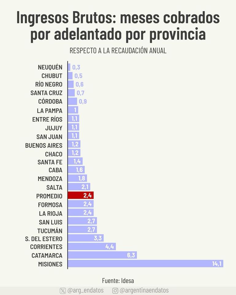 El portal Argentina en Datos reveló que la provincia ostenta el menor promedio de meses cobrados por adelantado de Ingresos Brutos respecto a la recaudación