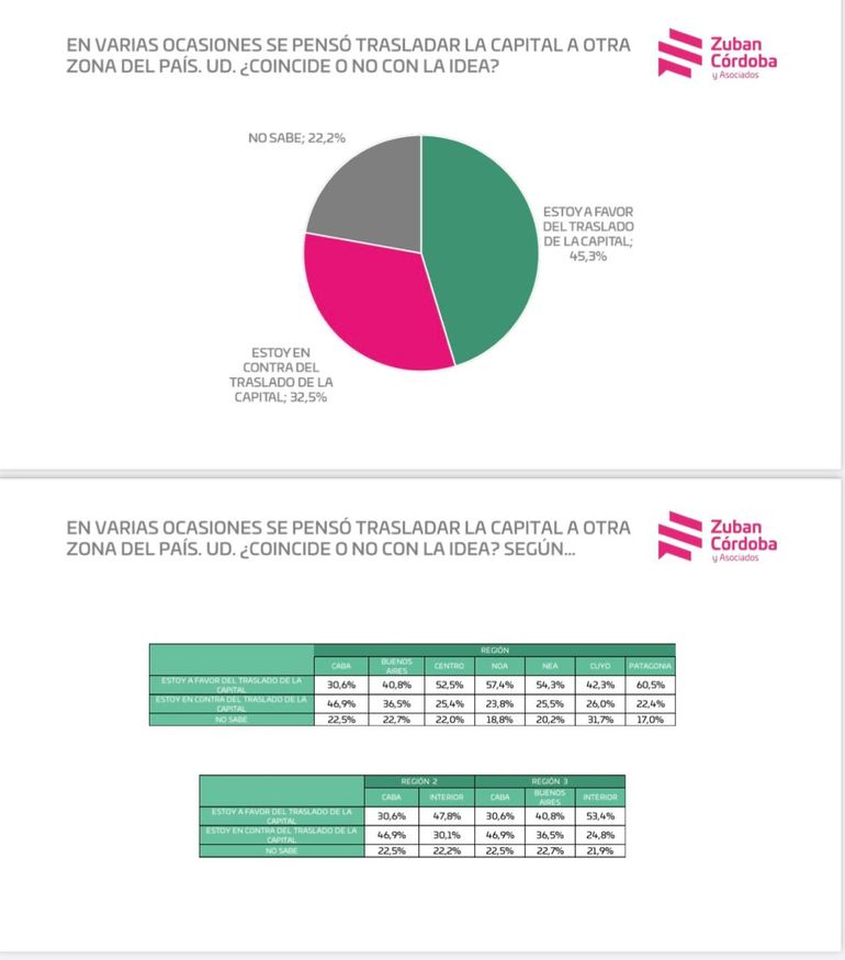 Los datos indicaron que el 45,3% de los encuestados está a favor de mudar la Ciudad Autónoma de Buenos Aires al interior del país, mientas que el 32,5% está en contra. En tanto que el 22,2% no sabe.