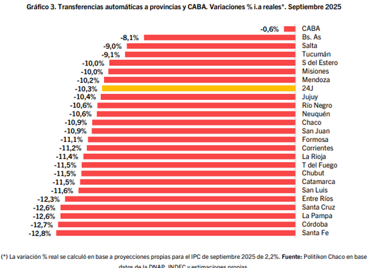 Según la consultora Politikon Chaco (que hizo estos cálculos con base en un IPC de 2,1% en septiembre) la baja se explica principalmente por la merma en la recaudación de Impuestos Internos (34,6%) y en Otros Coparticipados (83,2% por efecto de base comparativa por blanqueo en 2024); por su parte, Ganancias subio 3% y el IVA mejoró 1,2% mostraron alzas aunque menores, y no lograron compensar la caída de los otros tributos.