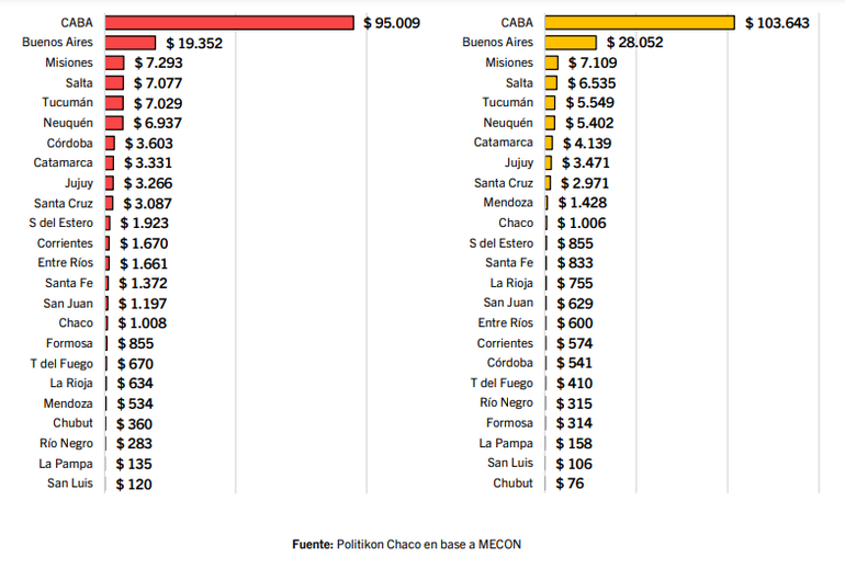 Bastante más lejos, en términos de participación, quedaron Buenos Aires (11,5% devengado y 16% pagado) y Misiones (4,3% devengado y 4,0% pagado), que son las provincias que conforman el podio. En el extremo opuesto, La Pampa, San Luis y Chubut se ubican al fondo de la tabla.