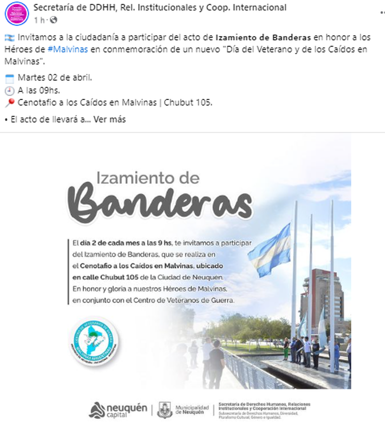 Con motivo de un nuevo aniversario, el Centro de Veteranos de Guerra "Malvinas Argentinas" de la Provincia de Neuquén invita a todos los vecinos y vecinas de esta ciudad a participar de las actividades y actos programados en conmemoración a la gesta histórica de recuperación de las Islas Malvinas el pasado 2 de abril de 1982.