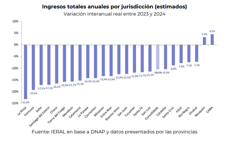 “En el caso de los recursos tributarios propios de las provincias, todos los meses del año 2024 exhibieron caídas interanuales, en valores constantes, que se aceleraron entre marzo y julio, y desaceleraron luego, aunque en diciembre aún se visualizaba una retracción real del 8,1% anual”, dice Monitor Fiscal de la Fundación Mediterránea.