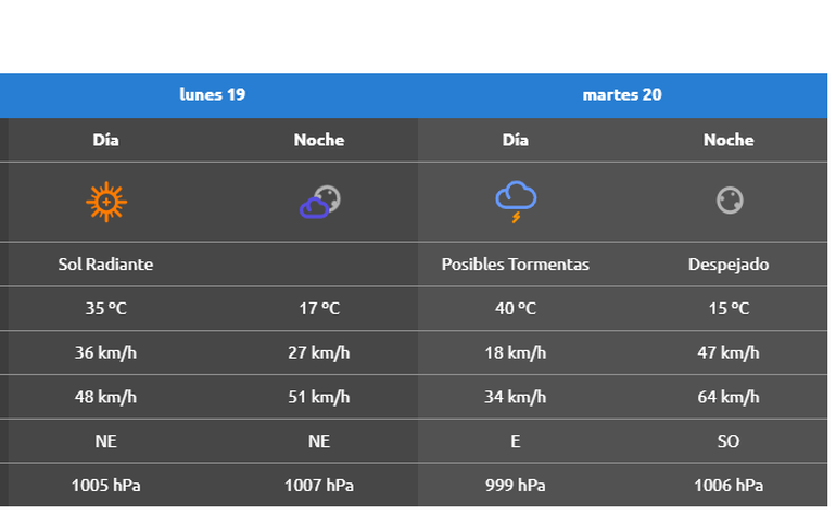 En tanto que, el SMN anticipó que se espera un martes caluroso y ventoso. La temperatura registrará 19 grados en la madrugada con viento leve y ráfagas entre 42 y 50 kilómetros por hora, En horas de la mañana ascenderá a 24 grados, estará soleado y disminuirá la intensidad del viento. Por la tarde empezará a estar algo nublado y la temperatura llegará a los 36 grados de máxima con viento de leve a moderado y ráfagas de hasta 50 kilómetros por hora. Hacia la noche estará algo nublado, la temperatura bajará a los 32 grados con viento de hasta 50 kilómetros por hora y ráfagas de casi 70 kilómetros por hora.