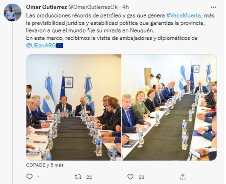 Gutiérrez adelantó que se está trabajando en convenios de cooperación entre la provincia, el gobierno nacional y la Unión Europea. “En ese sentido es que ellos decidieron venir por la escalabilidad y potencial de la actividad hidrocarburífera, y también por la necesidad de diversificar sus flujos de inversión también en Neuquén”, informó el gobernador.