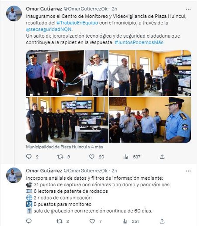 En este contexto se inauguró en Plaza Huincul el centro de monitoreo, para el cual se adquirieron 31 domos y 6 lectoras de patentes e identificación de vehículos, además de servidores, pantallas y televisores para observación rápida. Se destinaron más de 54 millones de pesos para adquirir los elementos.