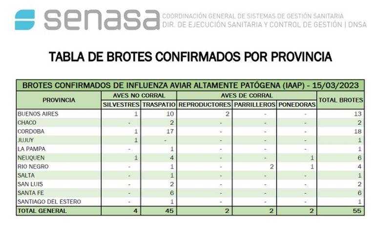 Un informe, que puntualiza la labor realizada por el organismo durante los primeros diez días de marzo, puntualiza que en la provincia del Neuquén se implementaron protocolos, tareas sanitarias y rastrillajes en los focos declarados en las localidades de San Patricio del Chañar y Las Lajas. "En ambos casos, se trató de aves de traspatio contagiadas con la enfermedad", precisaron.