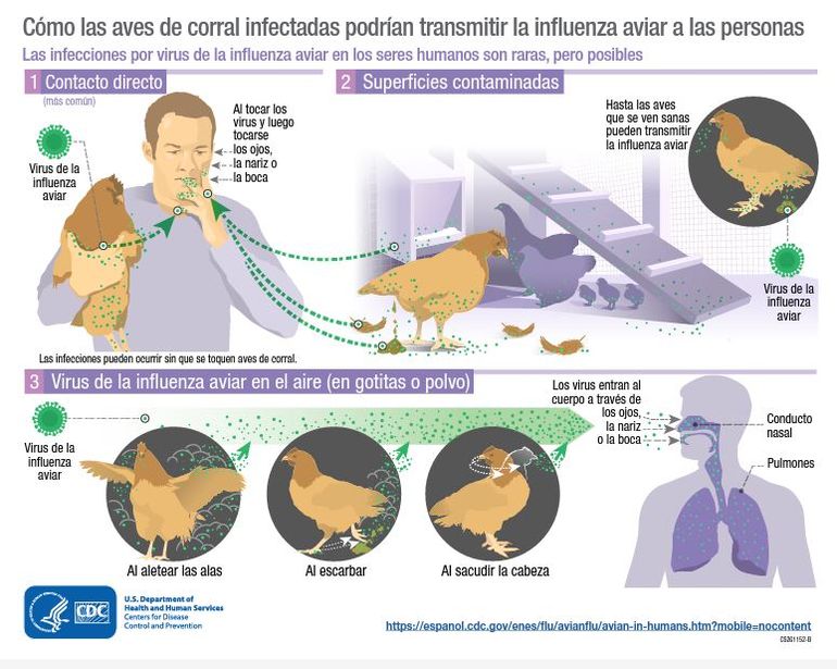 No se transmite a los humanos por consumo de carne o huevos. Solo se transmite por contacto directo al manipular aves enfermas o muertas por el virus a través de sus secreciones o excreciones.