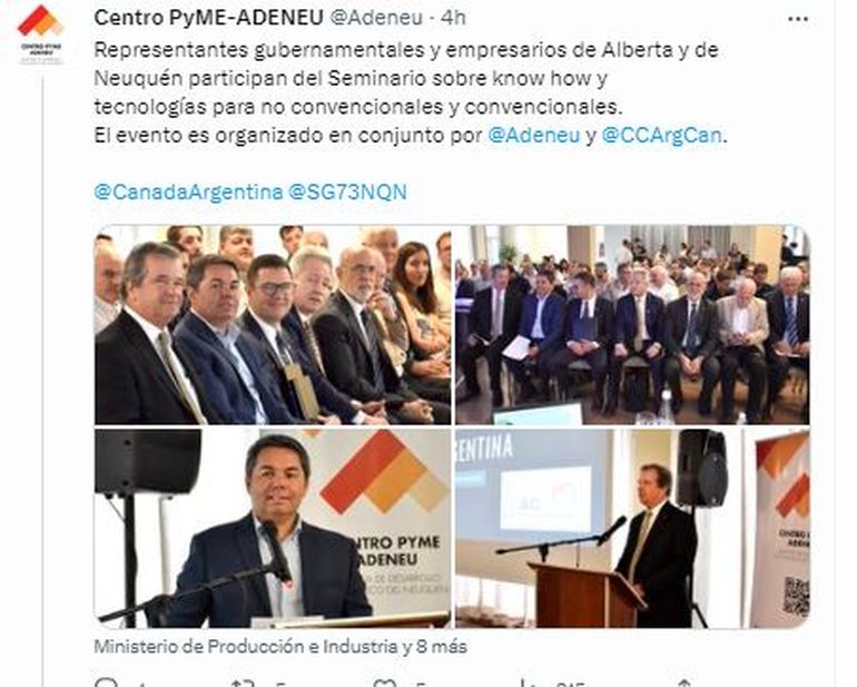 En ese sentido, señaló que la jornada será una instancia de intercambio “para aprender del conocimiento que tiene Canadá respecto a los trabajos que hacen a la sustentabilidad de la actividad hidrocarburìfera y el sector energético y a su vez compartirles como ha sido el desarrollo de los no convencionales en la provincia de Neuquén en los últimos años en los que se han consolidado niveles de eficiencia y calidad de excelencia”.