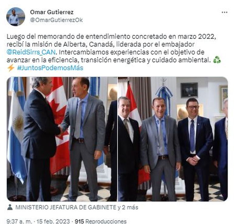 Por su parte, este miércoles por la mañana el gobernador Omar Gutiérrez se reunió con el embajador de Canadá para Argentina y Paraguay, Reid Sirrs, y una delegación de empresarios a fin de avanzar en las distintas fases del Memorándum de Entendimiento entre la provincia de Alberta (Canadá) y el Gobierno neuquino.
