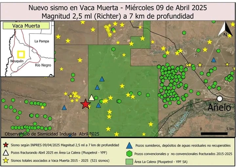 Desde el Observatorio de Sismicidad Inducida emitieron un comunicado respecto al nuevo sismo en Vaca Muerta. Informaron que tuvo una profundidad de 7 km y que el epicentro del sismo estuvo "localizado a tan solo 1,7 km de distancia de un equipo de fracturas que ha estado fracturando pozos durante el mes de Marzo en el área La Calera, operada por Pluspetrol"