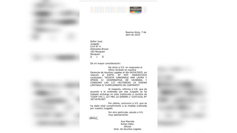 Dos entidades bancarias concretaron el embargo ordenado por la Justicia sobre las cuentas de la Cooperativa 127 Hectáreas, investigada por la presunta estafa de lotes en Sirena Unificada y la Meseta. Las retenciones fueron efectuadas por el Banco Provincia de Neuquén (BPN) y Credicoop, a requerimiento del Juzgado Civil N°4.
