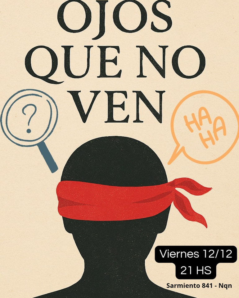 "Ojos que no ven". Se trata de la muestra de fin de año del taller de teatro, donde se verá todo lo creado, aprendido y vivenciado durante el proceso de aprendizaje teatral del último año. Será el viernes 12 de diciembre a las 21, en Deriva Teatro, Sarmiento 841.