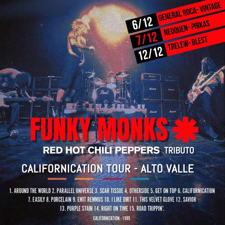 Funky Monks, provenientes de la ciudad de Puerto Madryn, llegan con el show “ CALIFORNICATION TOUR”, en el que interpretaran integro el disco bisagra en la carrera de los RHCP, Disco que en el 2024 cumplió 25 años y que significó la reivindicación de la banda de Anthony Kiedis y Flea como máximos estandartes, con temas como Californication, Around the world y otherside entre otros. Además del emblemático disco, también interpretarán algunos de sus más grandes éxitos fuera de este disco, como Under the bridge, Give it away y más.