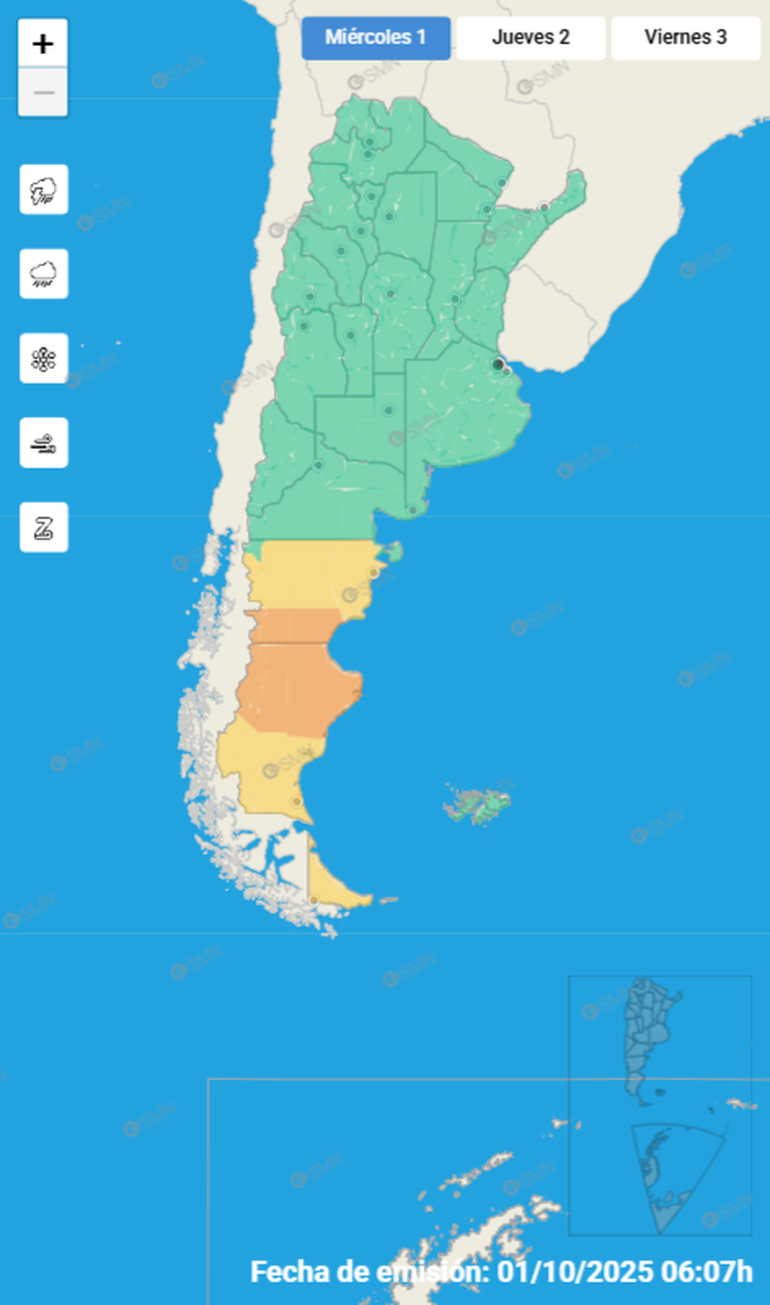 Por su parte, rige una alerta naranja para el sur de Chubut y el norte de Santa Cruz. "El área será afectada por vientos del sector oeste con velocidades entre 60 y 70 km/h, y ráfagas que podrán alcanzar los 120 km/h", detalla el organismo nacional.