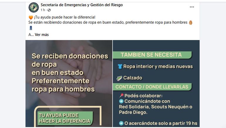 Desde la Secretaría de Emergencias y Gestión de Riesgo de la provincia informaron que la colecta es una iniciativa de estas organizaciones para que la comunidad pueda realizar donaciones de ropa en buen estado, preferentemente ropa para hombres. Además, se necesita ropa interior y medias nuevas. Indicaron que este tipo de prendas deben ser nuevas por razones de higiene.