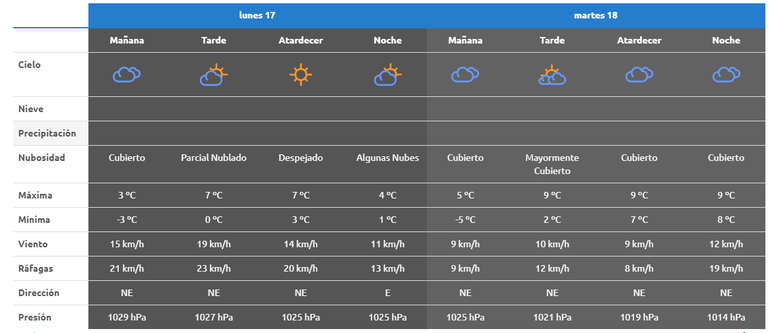 El lunes y martes las temperaturas máximas que se pueden registrar será de 9°C y como mínima se estima que se pueden haber temperaturas bajo cero, alcanzando los -5°C durante la mañana del martes. Además, durante estos días se espera que esté mayormente nublado.