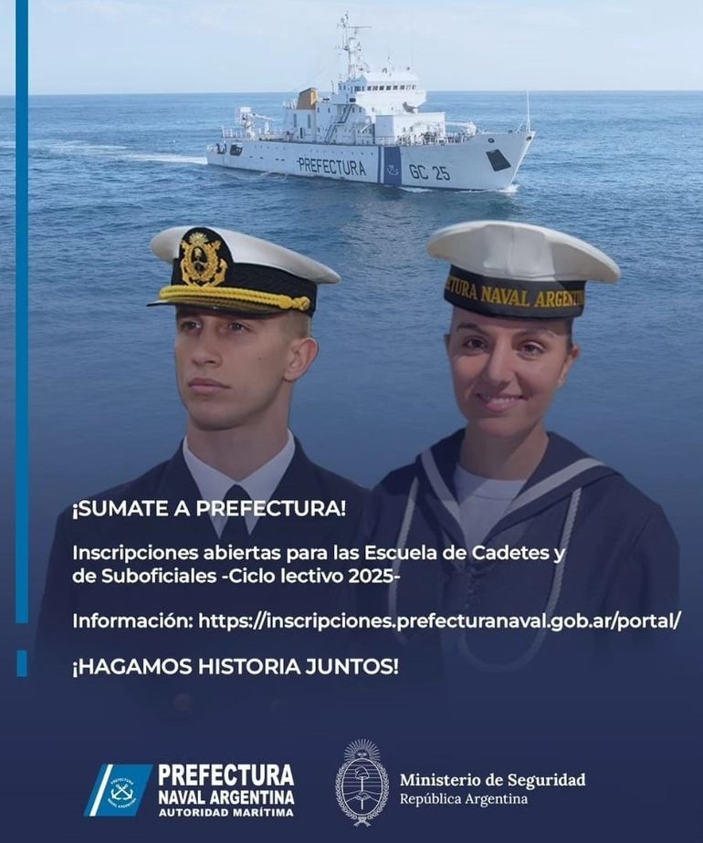 La Prefectura del Comahue, con sede central en la capital neuquina, informó que se encuentra abierta la convocatoria para jóvenes de ambos sexos, interesados en ingresar a los Institutos de formación que tiene la autoridad marítima nacional. El plazo para anotarse se extiende hasta el 30 de agosto.