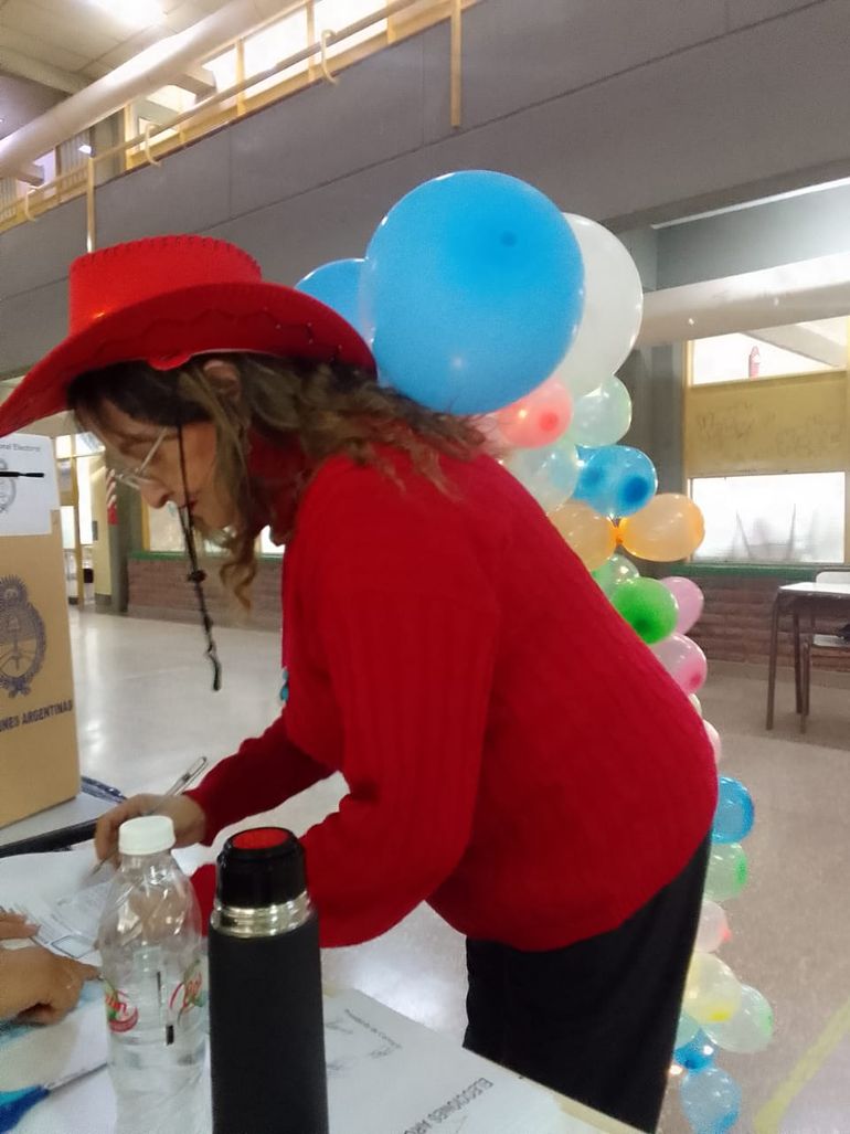 Tal es el caso del CPEM 1 de la localidad de Centenario, donde una señora llegó a votar con un sombrero vaquero color rojo y globos de distintos colores: "La democracia se festeja", justificó la ciudadana.