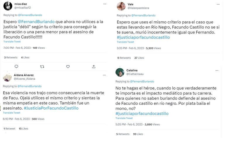 Con la idea de apelar para que los tres rugbiers sean alcanzados por la sentencia de prisión perpetua (al igual que Máximo Thomsen, Ciro Pertossi, Enzo Comelli, Benicelli y Luciano Pertossi), Burlando expresó con enojo: "La Justicia débil y contemplativa no es justicia. No se entiende cómo beneficiaron a tres acusados como partícipes secundarios. Esto de ser salomónico con algunos fallos, eso es lo que venimos a cuestionar. Nadie tuvo contemplación con Fernando. Hubo clemencia con los tres acusados de modo irracional", lamentó el letrado al insistir que hubo un plan premeditado por los ocho rugbiers de Zárate atacar por la espalda al joven y matarlo. Enseguida, quienes cuestionan su rol en el caso del crimen de Facundo Castillo, alzaron sus voces en Twitter.