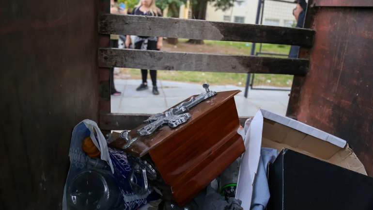Sobre una montaña de basura suelta, cajas, botellas, envoltorios; una urna funeraria para cenizas, tirada en el canasto. El objeto tiene no más de 50 centímetros de largo, 30 de profundidad y 20 de largo. A simple vista parece ser de buena calidad y se encuentra en buenas condiciones. Es de madera barnizada, con manijas y una imponente cruz en la tapa hechas de metal.