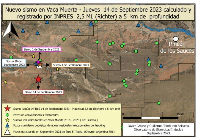 Los especialistas presentaron un mapa complementario a la información que dio a conocer el Inpres donde destacaron que en la misma zona de Rincón, donde se produjo el movimiento sísmico, hubo otros similares los días 2, 3 y 10 de este mes. Los investigadores indicaron que los sismos tendrían relación con las fracturas que realizan las distintas operadoras de Vaca Muerta.