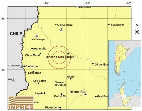 El epicentro del sismo se localizó a unos 110 kilómetros al noroeste de Neuquén; a 415 kilómetros al oeste de Santa Rosa, capital de La Pampa; a 80 kilómetros al sur de de Rincón De Los Sauces.
