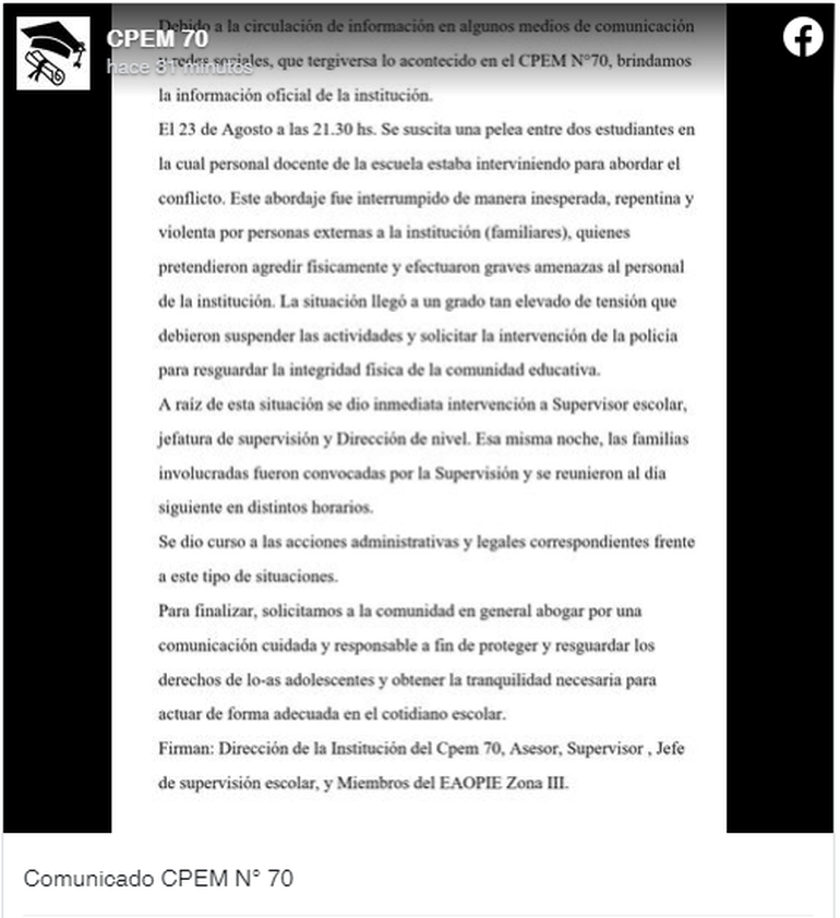 En su denuncia pública, cuestionaron el "avasallamiento" que sufrieron docentes y estudiantes y aclararon que no van a tolerar prácticas que consideraron "repudiables" como forma de resolver los conflictos. "No vamos a permitir ningún tipo de violencia hacia nuestros estudiantes y trabajadores del CPEM 70", manifestaron desde la dirección.