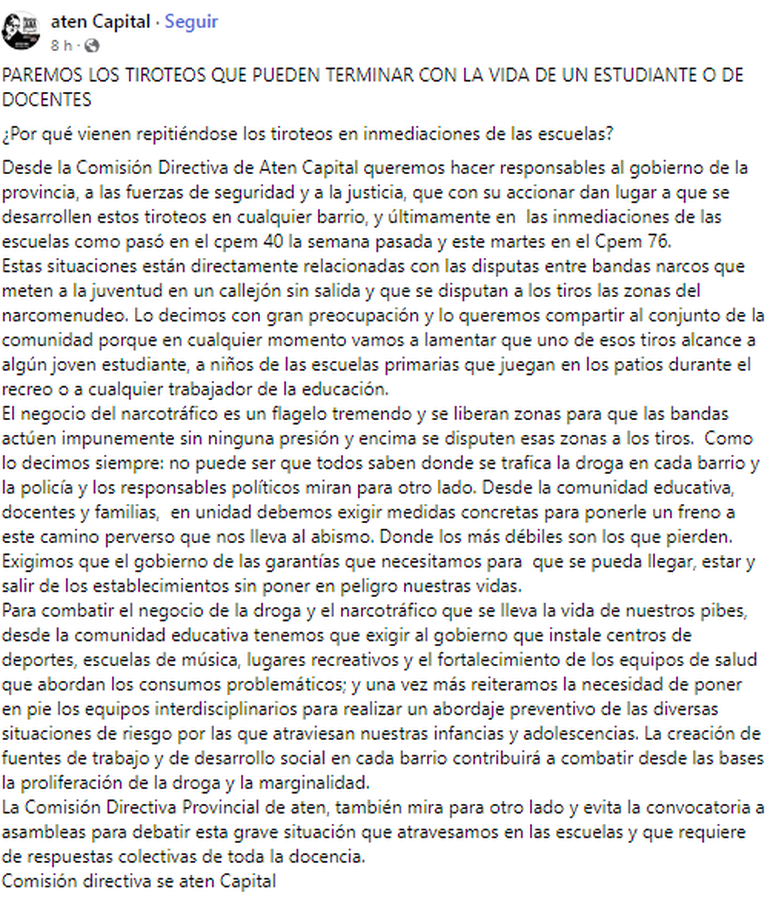 Desde ATEN Capital emitieron un comunicado que fue de público conocimiento a través de las redes sociales. De esta manera, reclamaron: "Paremos los tiroteos que pueden terminar con la vida de un estudiante o docentes".