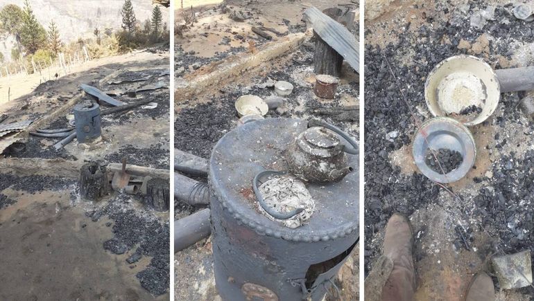 En una recorrida por la zona, Ocares realizó un registro fotográfico muy impactante. Donde había un puesto de veranada, solo quedaron cenizas y algunos utensilios y artefactos de cocina calcinados por el fuego, como la pava derretida que todavía se puede apreciar arriba de una estufa.