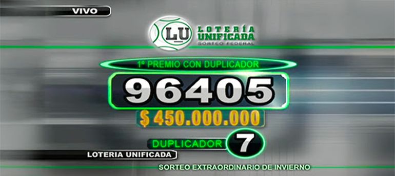 El primer premio del Sorteo Extraordinario de Invierno de la Lotería Unificada fue para el número 96405. Este premio fue asignado a las provincias de Neuquén y Mendoza con duplicador, el cual fue el número 7.