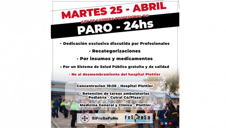 Un nuevo paro provincial de Siprosapune tiene de protagonistas a los profesionales del sistema público de salud en demanda de recurso humano en hospitales y centros de salud, recategorizaciones, insumos y el tratamiento del proyecto de ley de carrera profesional. Esta vez, los médicos dan cuenta de la gravedad de la situación en los hospitales de Plottier y el de Cutral-Plaza Huincul.