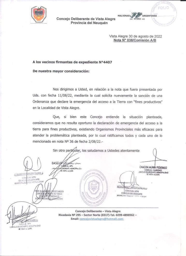 El rechazo a la solicitud de los parceleros fue firmado por unanimidad, de todos los partidos por los concejales Gonzalo Hernández, Luciano Bascur, Luisa Marilú Gutiérrez y Carmen Albarracín del MPN; también Patricio Poblete y Elsa Chistiansen de Frente de Todos y Munir Chacón de Juntos por el Cambio.
