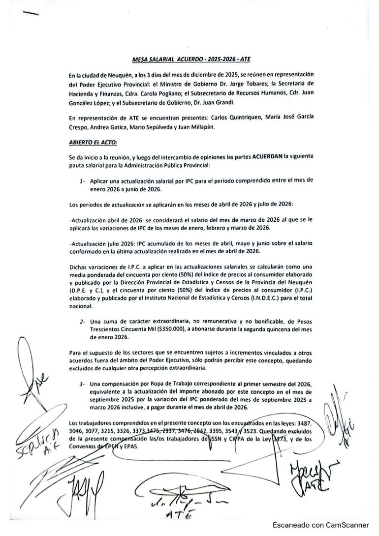 El Gobierno provincial y los representantes de la Asociación de Trabajadores del Estado de Neuquén (ATE) firmarfon este miércoles al mediodía el acuerdo salarial en el marco de las paritarias 2026.