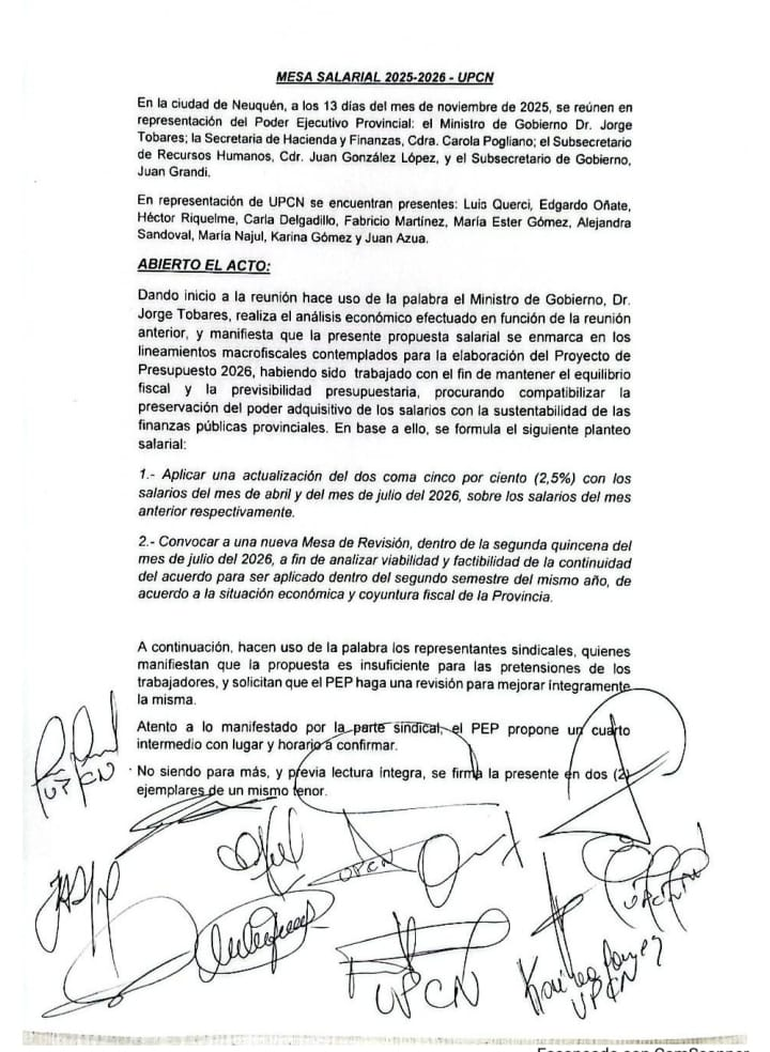 Se le propuso aplicar una actualización de 2,5% con los salarios del mes de abril y del mes de julio del 2026, sobre los salarios del mes anterior respectivamente.