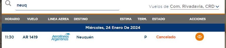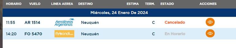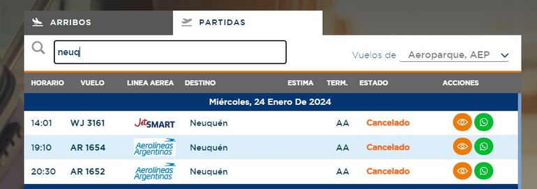 Hay tres vuelos con destino a Aeroparque, dos a Córdoba y uno a Comodoro Rivadavia, que se ven afectados por el paro del 24 de enero.